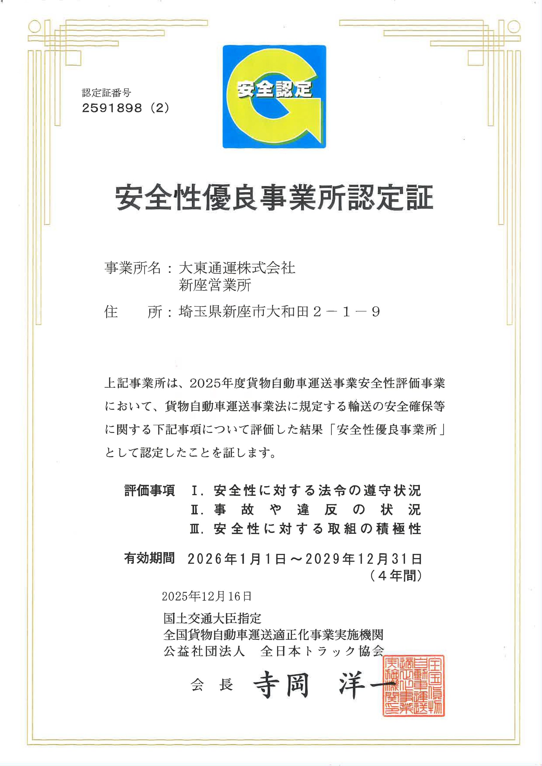 当社新座営業所が、国土交通大臣指定の全国貨物自動車運送適正化事業実施機関である全日本トラック協会から、安全性優良事業所の更新認定を受けました。